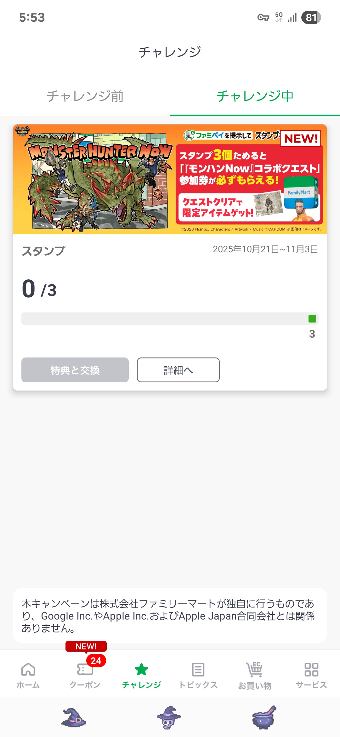 ファミペイのチャレンジにモンハンの項目ないけどゼリー買ったら出てくるの?