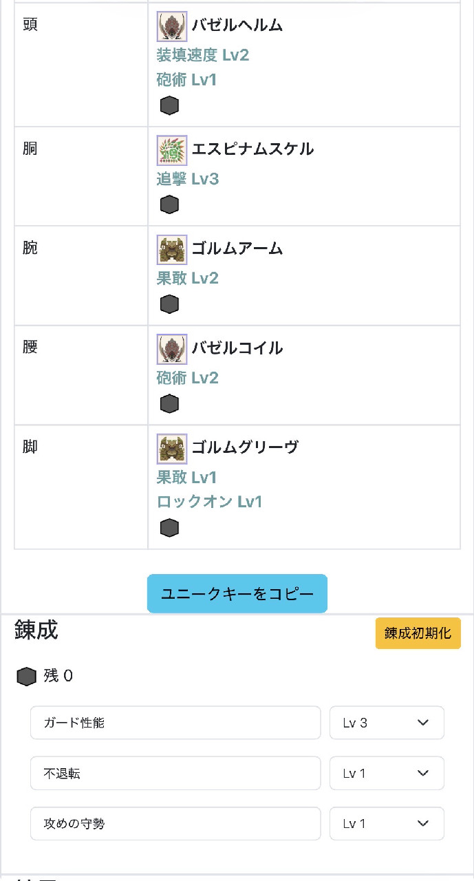 >>33これの頭バルキンでバサル胴をナス胴に変えたら砲撃40→20%になるけど部位破壊後は砲撃40%槍20%付くからいいかなと思ってナス胴を強化し始めたのに唯一付いてる不退転がバサル胴で泣いた